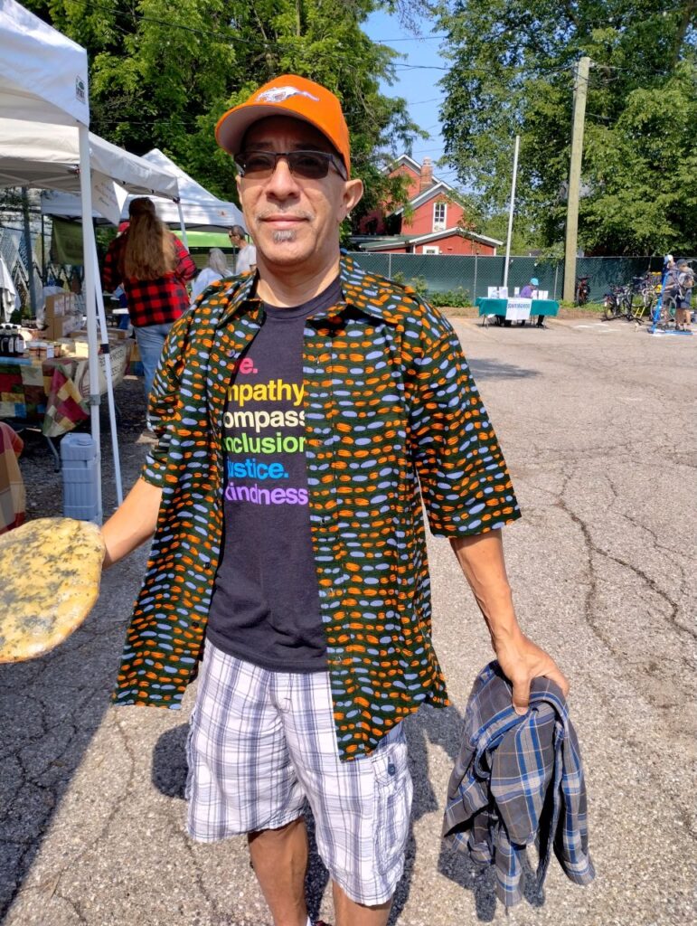 In the summer, Cyndi and I have been going to the outdoor Ypsilanti Farmer’s Market to buy local produce and, occasionally, other products. This year, Cyndi got me this cool handmade button-down shirt. It’s become one of my favorite shirts to wear during gigs